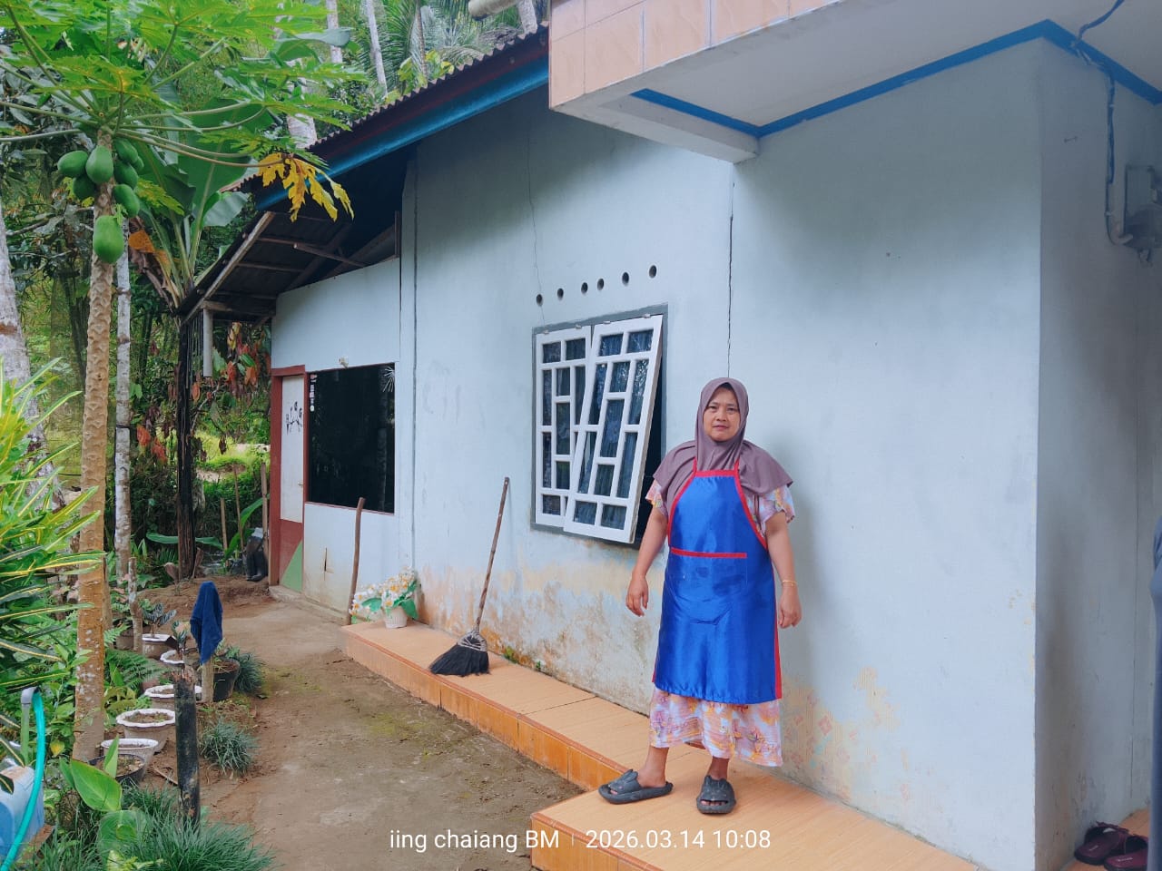 Titi Rubianti istri Rabain Sekcam Palupuh didepan rumahnya.