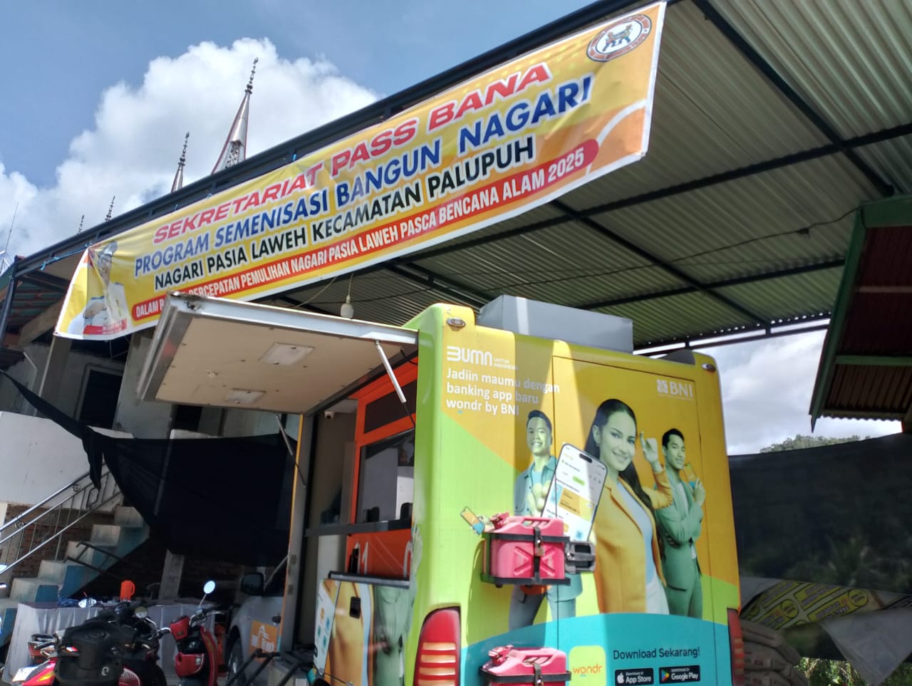 Memang terlihat satu unit mobil keliling Bank BNI terparkir dihalaman kantor wali nagari Pasia Laweh ini, yang dipersiapkan untuk pembukaan kartu rekening bagi penerima bantuan.