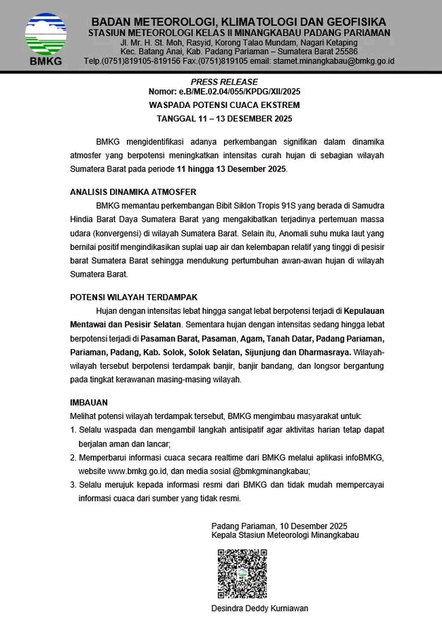 Padang Pariaman, BanuaMinang.co.id — Badan Meteorologi, Klimatologi dan Geofisika stasiun meteorologi kelas II Minangkabau Padang Pariaman, yang beralamat di Jl. Mr. H. St. Moh, Rasyid, Korong Talao Mundam, Nagari Ketaping, Kecamatan Batang Anai, Kabupaten Padang Pariaman, mengeluarkan press release dengan nomor e.B/ΜΕ.02.04/055/KPDG/XII/2025, pada Rabu, tanggal 10 Desember 2025.