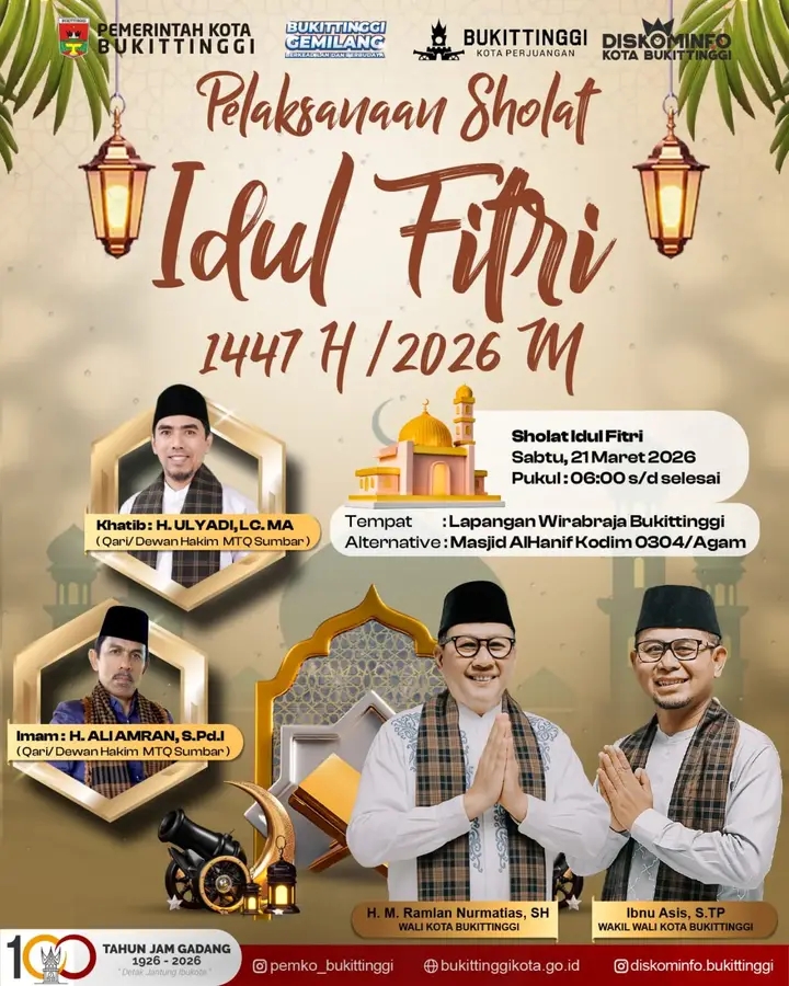 Pemerintah Kota Bukittinggi bersama Panitia Hari Besar Islam (PHBI) telah menyusun kegiatan pelaksanaan ibadah Shalat Idul Fitri 1447 H/2026 M. Shalat Id akan dipusatkan di Lapangan Wirabraja, namun waktu pelaksanaan atau penetapan 1 Syawal 1447 H, masih menunggu hasil keputusan sidang isbat Kementrian Agama RI, yang akan digelar Kamis mendatang.