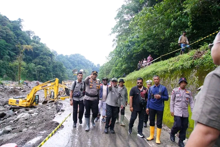 Usai meninjau perbaikan jalan dan normalisasi sungai di Mega Mendung, dilakukan asesmen terkait pekerjaan yang dilakukan Kementerian PU bersama, Bupati Tanah Datar Eka Putra SE.MM, Walikota Padang Panjang Hendri Arnis, Dandim 0307 TD, Kapolres Padang Panjang dan PPK 1 BPJN Sumatera Barat (Sumbar) Noor Arias Syamsul, ST di Lembah Anai, Minggu (7/12/2025).