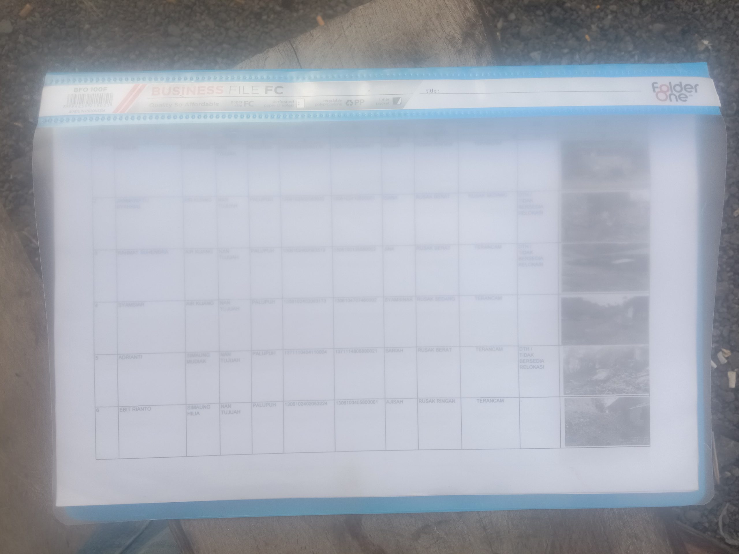 Hari Senin (19/1/26). BanuaMinang.co.id menerima satu berkas kertas berjudul Data kerusakan rumah pada kejadian bencana banjir, banjir bandang, longsor dan angin kencang di Kecamatan Palupuh. Berkas setebal 38 halaman ini berisi data-data nama kepala keluarga, alamat, nomor KK, NIK, nama ibu kandung, tingkat kerusakan, hasil verifikasi, keterangan terkait bersedia relokasi dan dilengkapi gambar pendukung berupa foto dari rumah tersebut.