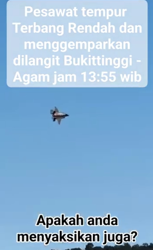 Agam, BanuaMinang.co.id Langit Sumatera Barat mendadak gempar. Warga di wilayah Agam, Bukittinggi hingga Payakumbuh dikejutkan oleh kemunculan pesawat tempur berwarna abu-abu yang melintas cepat dan rendah pada Rabu (1/4) siang.