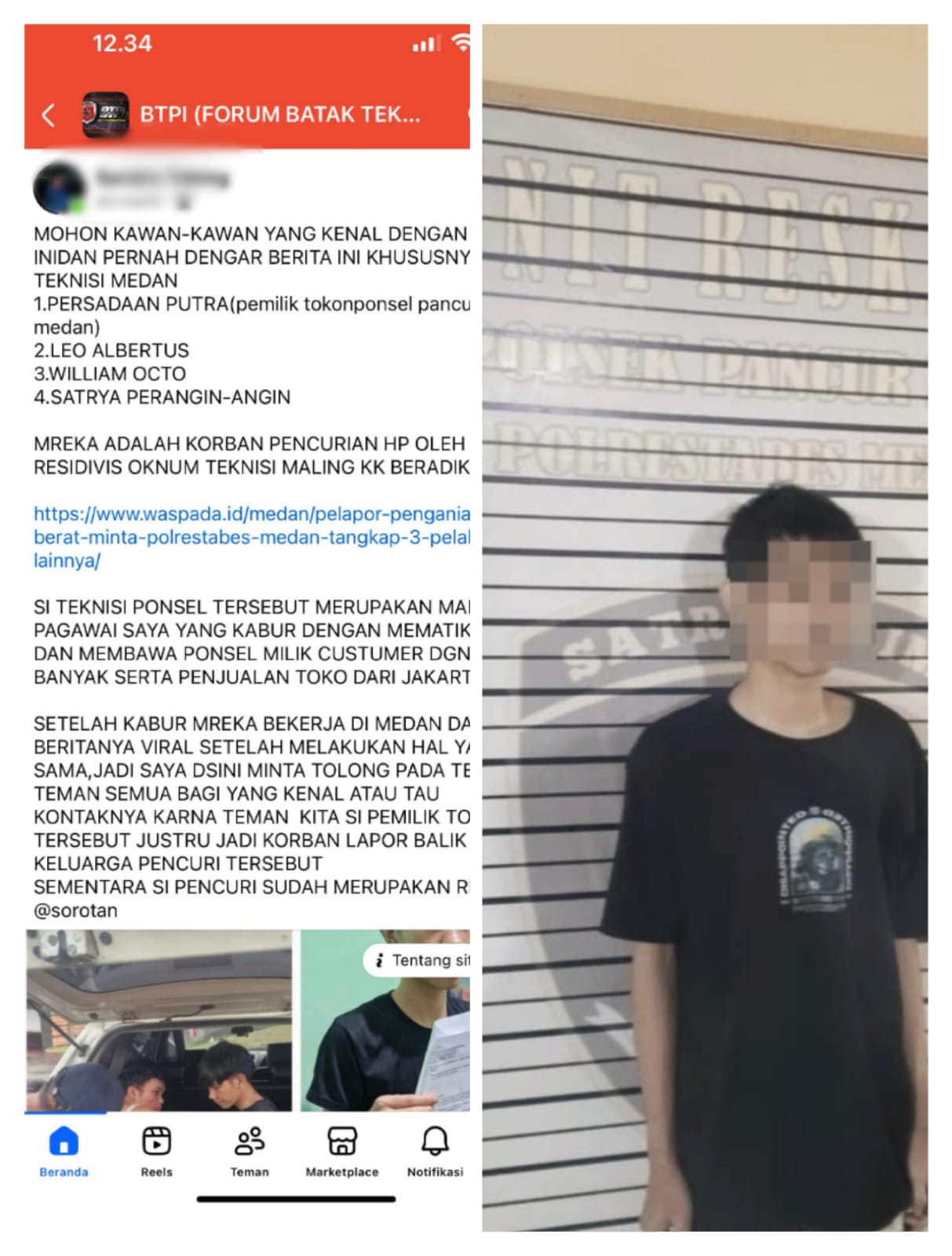 “Mohon kawan-kawan yang kenal dengan orang ini, pernah dengar berita khususnya teknisi Medan. Persadaan Putra, Leo Albertus, Wiliam Octo Satria Perangin Angin, Mereka adalah korban pencurian HP oleh residivis oknum teknisi maling kakak beradik,” tulisnya.