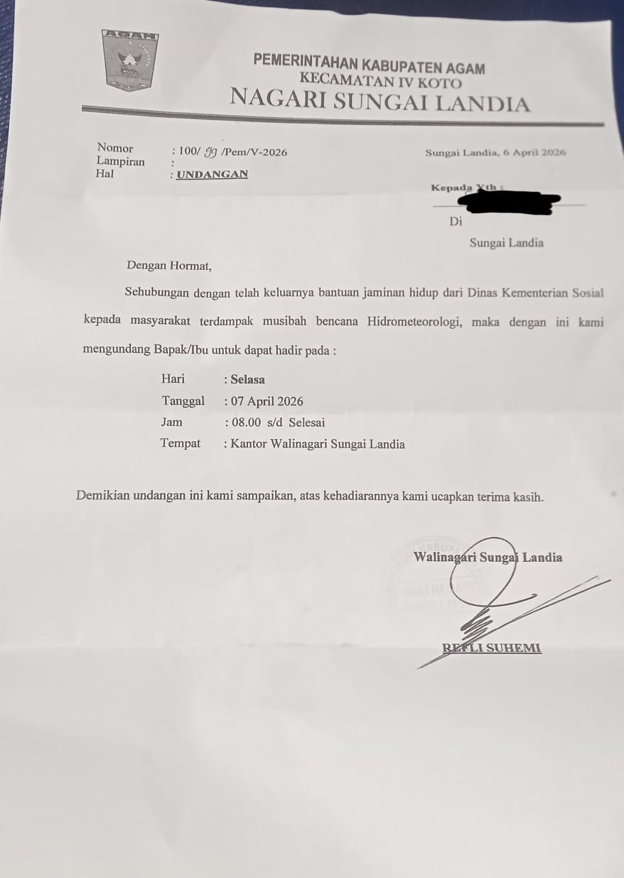 IV Koto, BanuaMinang.co.id Masyarakat terdampak musibah bencana Hidrometeorologi 2025 di Nagari Sungai Landia, Kecamatan IV Koto, hari ini (Selasa, 7/4/26) mendatangi kantor Walinagari Sungai Landia. Hal ini berdasarkan undangan bernomor 100/gg/Pem/V-2026 yang berisikan tentang telah keluarnya bantuan jaminan hidup dari Dinas Kementerian Sosial kepada masyarakat terdampak musibah bencana Hidrometeorologi.