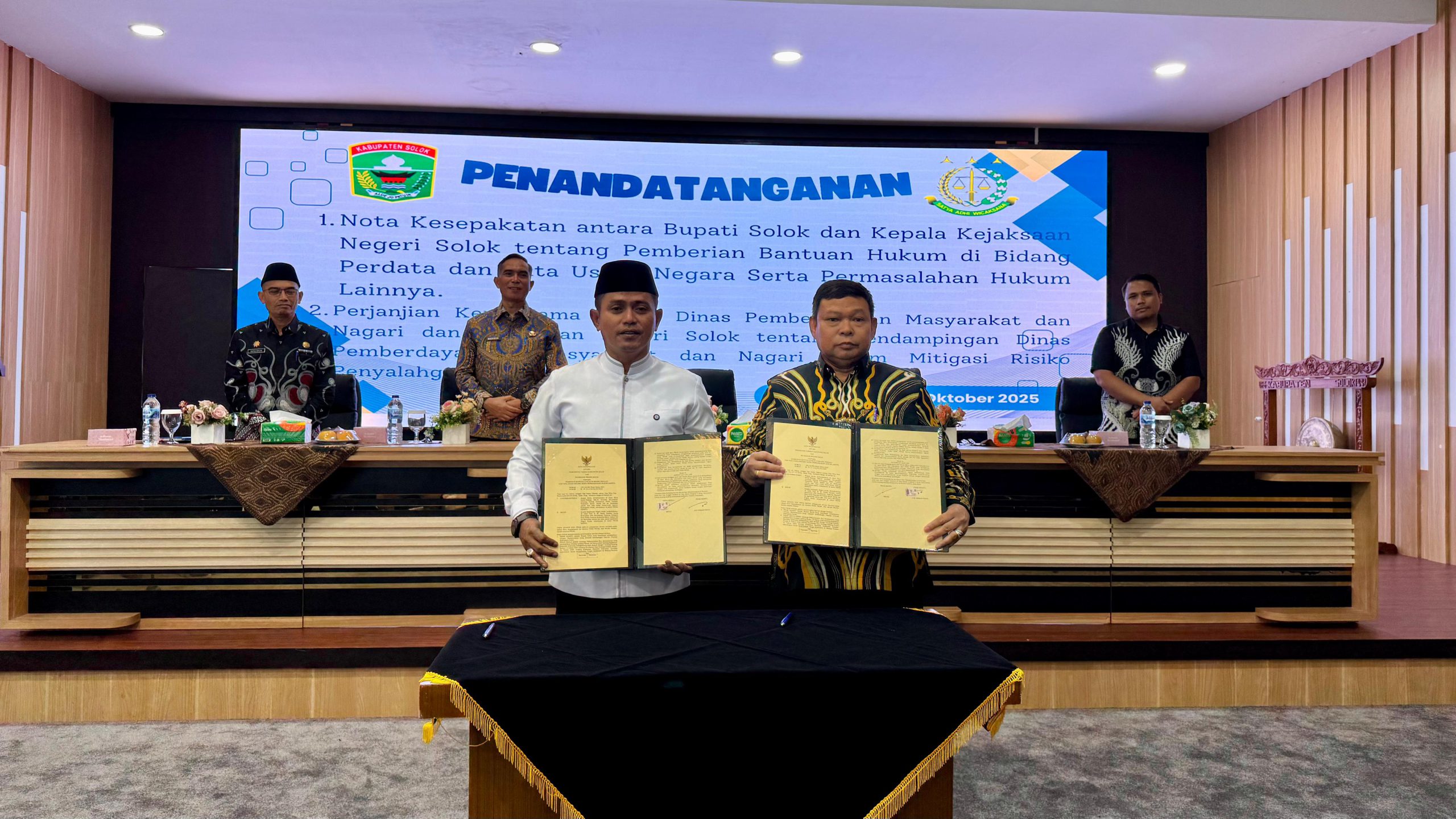 Arosuka, BanuaMinang.co.idPemerintah Kabupaten Solok bersama Kejaksaan Negeri Solok menandatangani Nota Kesepakatan dan Perjanjian Kerja Sama terkait pemberian bantuan hukum di bidang perdata, tata usaha negara, serta pembimbingan dalam program Jaga Nagari. Kegiatan ini berlangsung di Aula Gedung C, Sekretariat Daerah Kabupaten Solok, pada Jumat(03/10/2025).