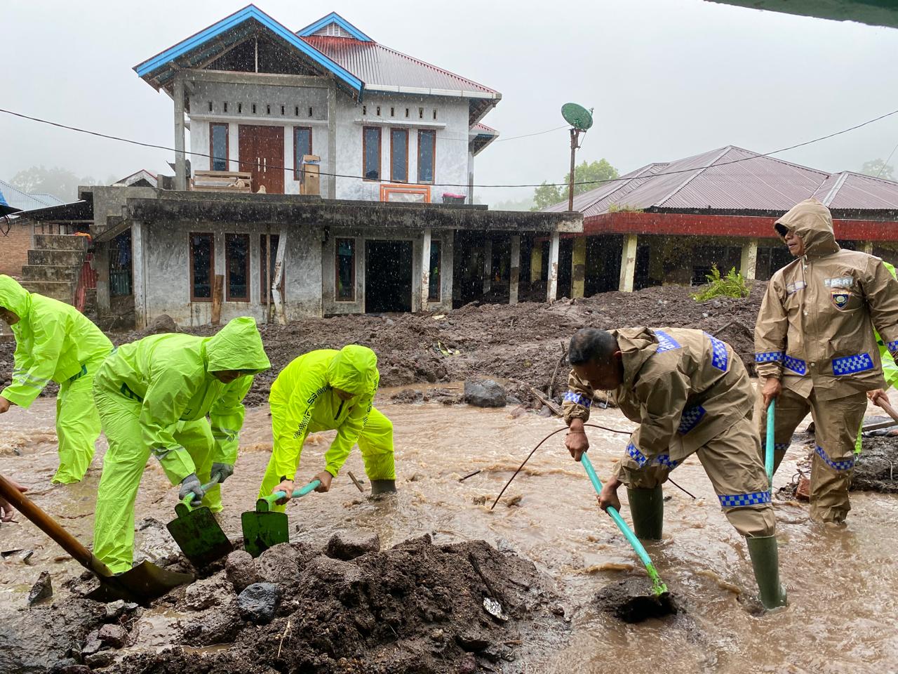Personil Polresta Bukittinggi Bantu Bersihkan Material Longsor di Malalak Timur