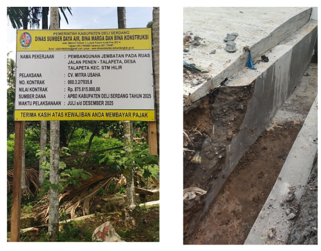 Deliserdang, BanuaMinang.co.id — Pembangunan Jembatan pada ruas jalan Penen – Talepeta, Desa Talapeta Kecamatan STM Hilir Kabupaten Deli Serdang Sumatera Utara yang di kerjakan CV. Mitra Usaha melalui Angaran Dinas Sumber Daya Air Bina Marga dan Bina Konstruksi (SDABMBK) Senilai Rp. 875.615.000.00 yang menggunakan APBD Kabupaten Deli Serdang tahun Anggaran 2025 di keluhkan Warga, Minggu (12/10/2025) Sekira Pukul 16.00 Wib