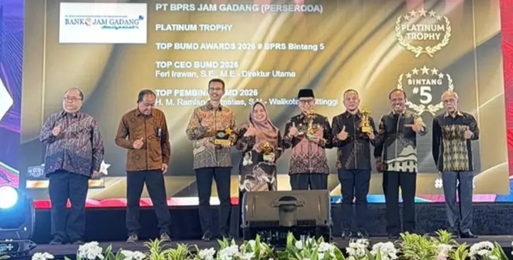 Tidak tanggung tanggung, PT BPRS Jam Gadang Bukittinggi berhasil memboyong empat penghargaan bergengsi, TOP Pembina BUMD 2026 yang diberikan kepada Wali Kota Bukittinggi, Ramlan Nurmatias, Platinum Trophy TOP BUMD Awards 2026 untuk PT BPRS Jam Gadang (Perseroda) sebagai BUMD Bintang 5 selama lima tahun berturut-turut. Selain itu, PT BPRS Jam Gadang juga meraih TOP BUMD Awards 2026 Bintang 5, serta TOP CEO BUMD 2026 yang diberikan kepada Direktur Utama, Feri Irawan.