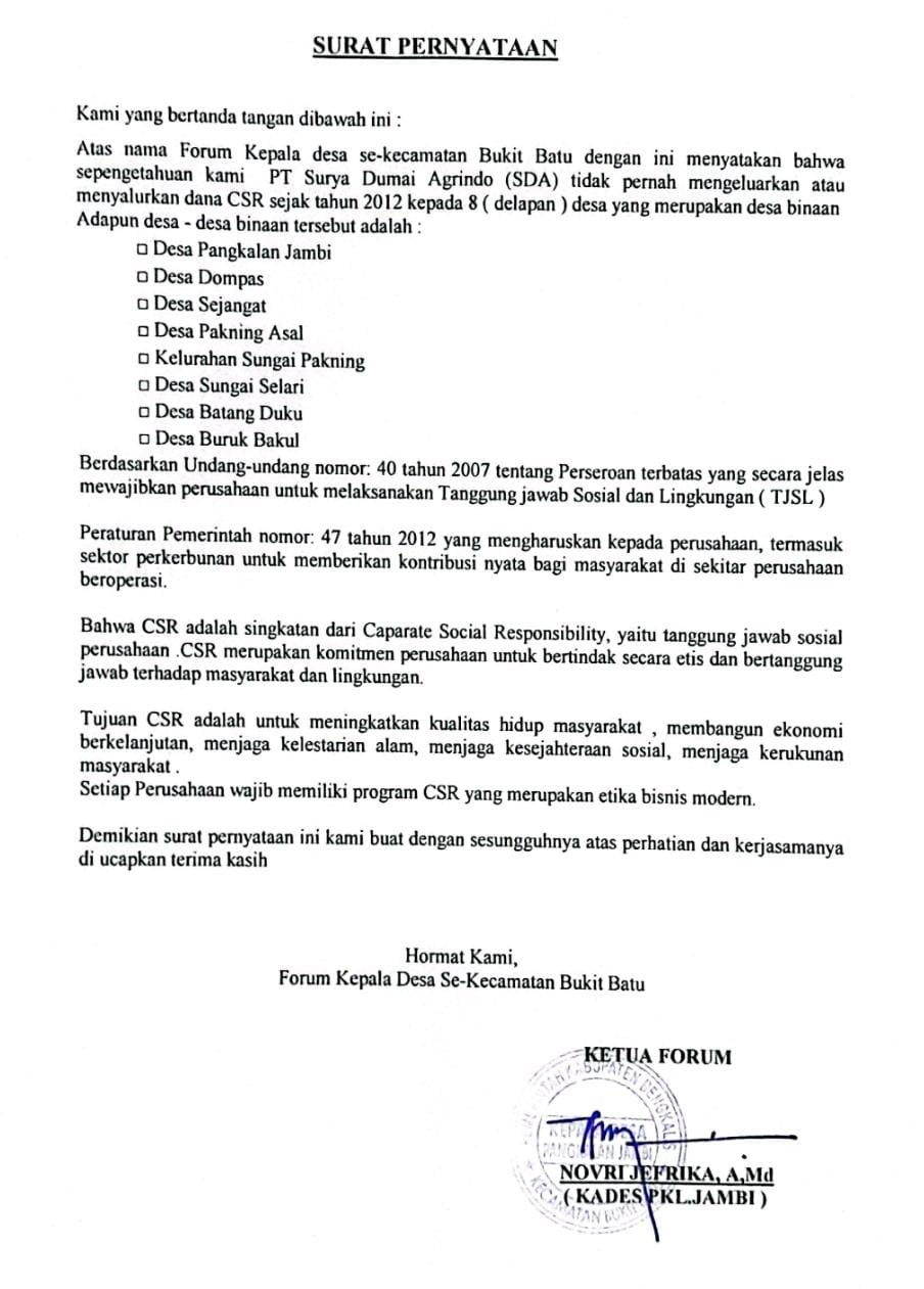 Kekecewaan tersebut disampaikan secara resmi oleh Forum Kepala Desa se-Kecamatan Bukit Batu melalui surat pernyataan yang ditandatangani oleh Ketua Forum, Novri Jefrika, yang juga menjabat sebagai Kepala Desa Pangkalan Jambi.