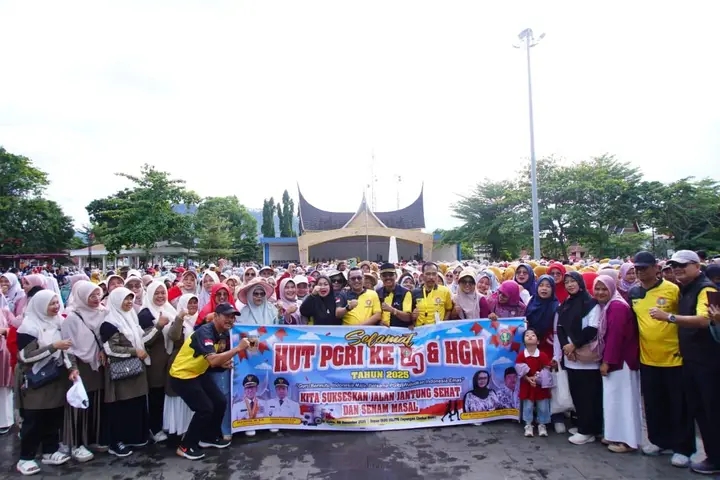 Batusangkar, BanuaMinang.co.id Luar biasa, ribuan guru se Tanah Datar ikuti gerak jalan jantung sehat dalam rangka peringatan Hari Guru Nasional tahun 2025 dan ulang tahun Persatuan Guru Republik Indonesia (PGRI) ke – 80 yang digelar oleh pengurus PGRI Tanah Datar, Sabtu (22/11/2025) Lapangan Cindua Mato Batusangkar.
