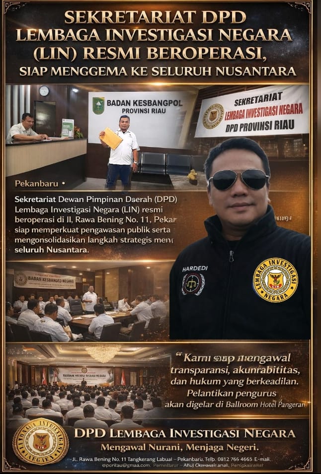 ‎Pekanbaru, BanuaMinang.co.id Lembaga Investigasi Negara (LIN) kembali menegaskan eksistensinya sebagai garda terdepan pengawasan publik. Sekretariat Dewan Pimpinan Daerah (DPD) Lembaga Investigasi Negara kini resmi mulai beroperasi dan beralamat di Jalan Rawa Bening Nomor 11. Pekanbaru.