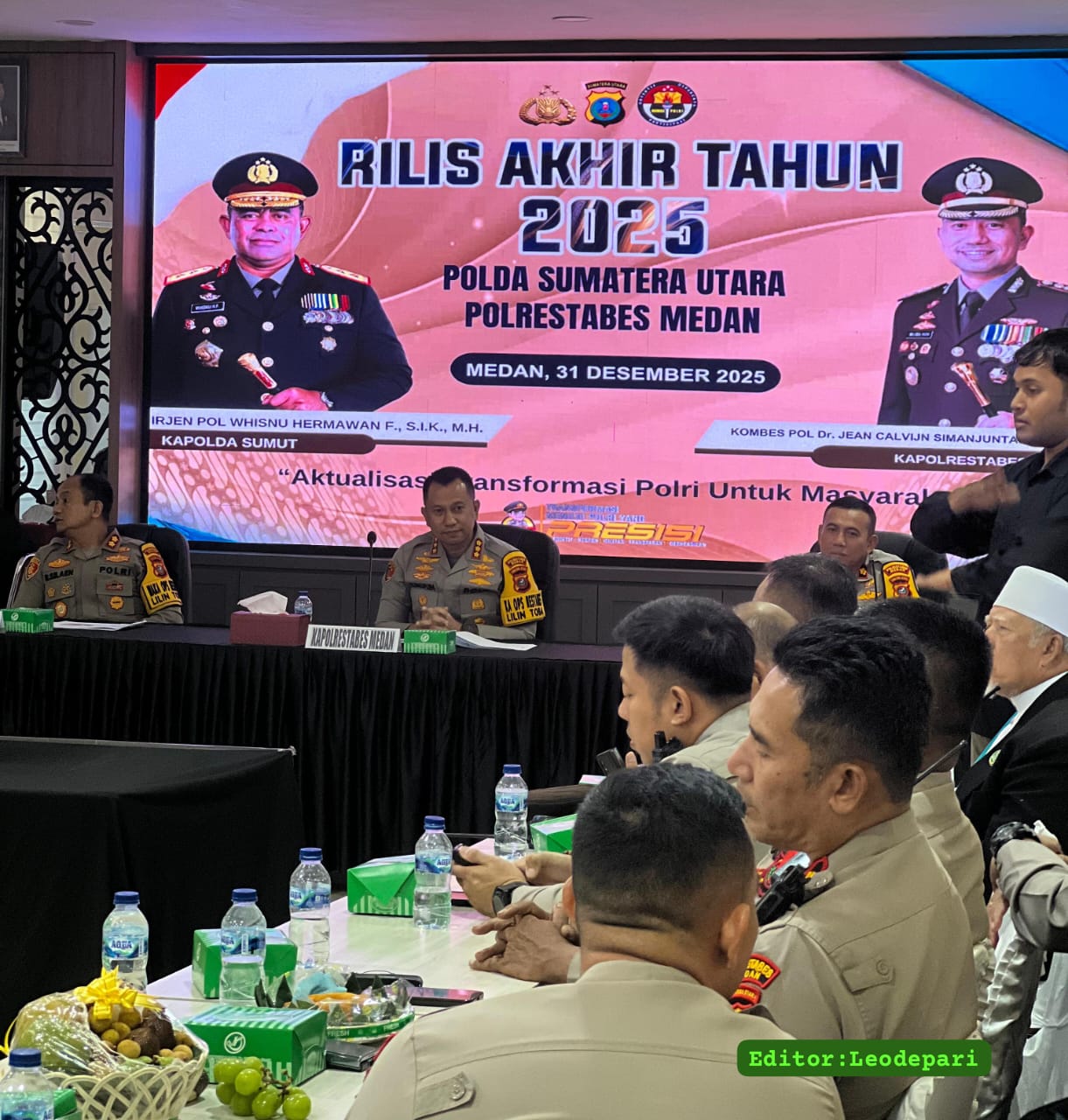 “Banyak faktor yang mempengaruhi menurunnya jumlah laporan yang kita terima di Polrestabes pada tahun ini. Mungkin ini dipengaruhi kegiatan-kegiatan pencegahan yang kita lakukan seperti, deteksi dini ada sekitar 356 kegiatan, Door To Door Sistem (DDS), 107.643 kegiatan, problem solving sekitar 415 kegiatan, bimbingan dan penyuluhan (Binluh), 43.010 kegiatan, Tiktok 4820 kegiatan, Satkamling 2.999 kegiatan, Go To School 346 kegiatan, Curhat Warga, 237 kegiatan, Jumat Barokah, 271 kegiatan, Minggu kasih, 256 kegiatan dan penyaluran beras SPHP 208 kegiatan,”jelas Kapolrestabes Medan, Kombes Pol Dr Jean Calvijn Simanjuntak, SIK, MH saat menggelar Rilis Akhir Tahun 2025, Rabu (31/12) di Aula Patriatama Mapolrestabes Medan.