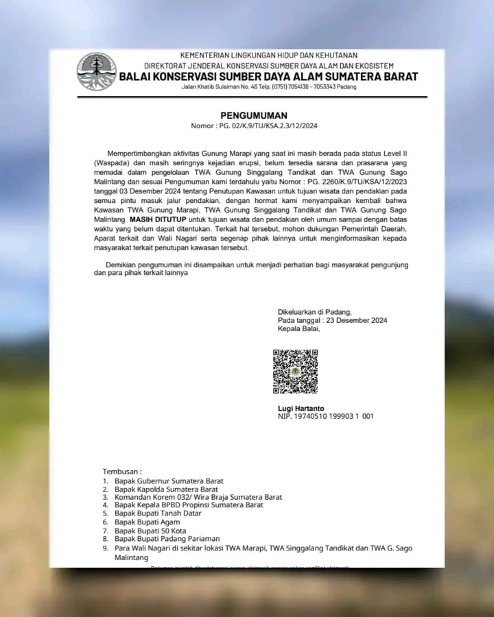 Mempertimbangkan aktivitas Gunung Marapi yang saat ini masih berada pada status Level II (Waspada) dan masih seringnya kejadian erupsi, belum tersedia sarana dan prasarana yang memadai dalam pengelolaan TWA Gunung Singgalang Tandikat dan TWA Gunung Sago Malintang dan sesuai Pengumuman kami terdahulu yaitu Nomor: PG. 2260/K.9/TU/KSA/12/2023 tanggal 03 Desember 2024 tentang Penutupan Kawasan untuk tujuan wisata dan pendakian pada semua pintu masuk jalur pendakian, dengan hormat kami menyampaikan kembali bahwa Kawasan TWA Gunung Marapi, TWA Gunung Singgalang Tandikat dan TWA Gunung Sago Malintang MASIH DITUTUP untuk tujuan wisata dan pendakian oleh umum sampai dengan batas waktu yang belum dapat ditentukan. Terkait hal tersebut, mohon dukungan Pemerintah Daerah, Aparat terkait dan Wali Nagari serta segenap pihak lainnya untuk menginformasikan kepada masyarakat terkait penutupan kawasan tersebut.