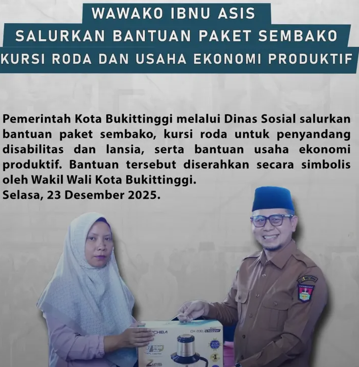 Bukittinggi, BanuaMinang.co.id Pemerintah Kota Bukittinggi melalui Dinas Sosial salurkan bantuan paket sembako, kursi roda untuk penyandang disabilitas dan lansia, serta bantuan usaha ekonomi produktif. Bantuan tersebut diserahkan secara simbolis oleh Wakil Wali Kota Bukittinggi, Selasa, 23 Desember 2025.